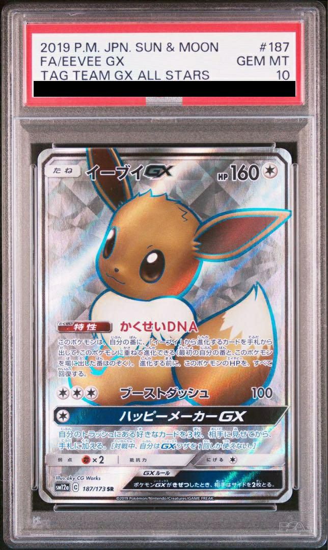 イーブイGX(187/173)は、ハイクラスパック「TAG TEAM GX タッグオールスターズ」に収録された無色タイプのたねポケモンGXで、スーパーレア(SR)仕様のカードです。特性「かくせいDNA」により、自分の番に手札から「イーブイ」から進化するカードを重ねて進化させる際、このポケモンのHPを全回復できます。ワザ「ブーストダッシュ」は100ダメージを与えます。GXワザ「ハッピーメーカーGX」は、トラッシュから好きなカードを3枚手札に加えることができます。これらの能力により、柔軟な進化と手札補充が可能で、デッキの戦略性を高めます。SR版のカードは、特別なイラストが施されており、コレクターから高い評価を受けています。