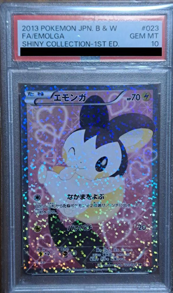 エモンガ(023/020)は、拡張パック「シャイニーコレクション」に収録された雷タイプのたねポケモンで、HP70を持ちます。ワザ「なかまをよぶ」は無色エネルギー1個で、自分の山札からたねポケモンを2枚まで選び、ベンチに出すことができます。「バチバチ」は雷エネルギー1個で20ダメージを与えます。これらのワザにより、序盤からベンチを充実させ、安定したダメージを与えることが可能です。SR(スーパーレア)版のイラストは、エモンガが笑顔でこちらを見つめる可愛らしいデザインが特徴で、コレクターズアイテムとしても人気があります。