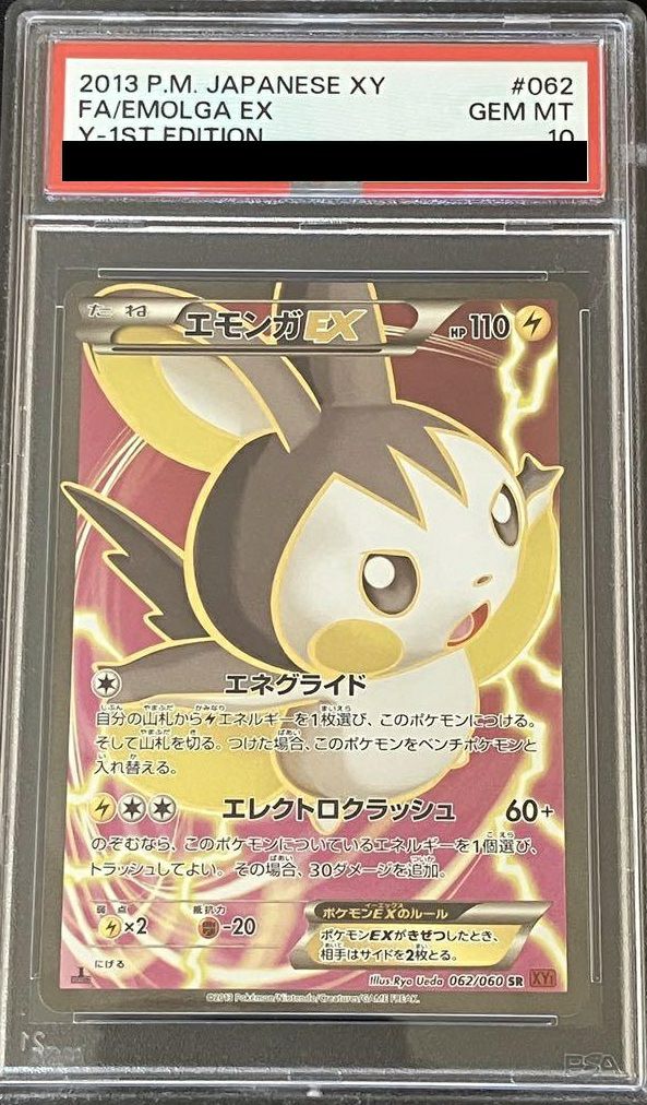 エモンガEX(062/060)は、拡張パック「コレクションY」に収録された雷タイプのたねポケモンで、HP110を持ちます。ワザ「エネグライド」は無色エネルギー1個で、自分の山札から雷エネルギーを1枚選び、このポケモンにつけ、その後山札を切ります。エネルギーをつけた場合、このポケモンをベンチポケモンと入れ替えます。「エレクトロクラッシュ」は雷エネルギー1個と無色エネルギー2個で60ダメージを与え、望むならこのポケモンについているエネルギーを1個トラッシュし、その場合30ダメージを追加します。これらのワザにより、エネルギー加速と柔軟な立ち回りが可能です。SR(スーパーレア)版のイラストは、エモンガが躍動感あふれるポーズで描かれており、特別な光沢が施されています。このカードは、2014年1月31日に発売された拡張パック「コレクションY」に収録されています。