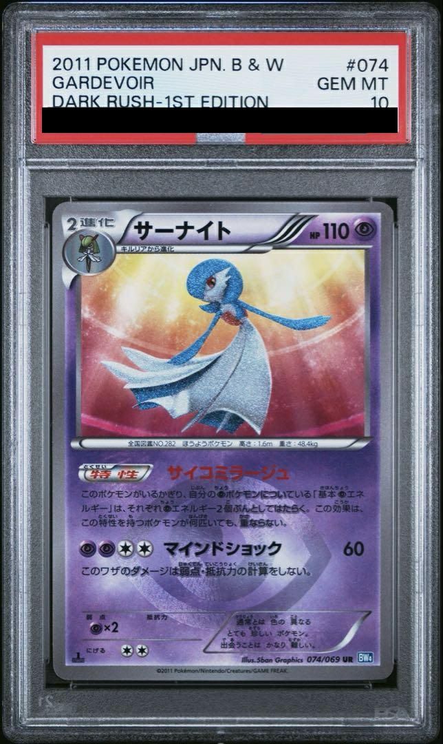 サーナイト(074/069)[UR]は、拡張パック「ダークラッシュ」に収録された超タイプの2進化ポケモンで、HPは110です。特性「サイコミラージュ」により、自分の超ポケモンに付いている基本超エネルギーがそれぞれ2個分として働き、エネルギー加速をサポートします。ワザ「マインドショック」は超エネルギー2個と無色エネルギー2個で60ダメージを与え、弱点・抵抗力を無視して攻撃可能です。このカードは、デッキ内の超エネルギーの効率的な運用を促進し、攻撃の幅を広げる役割を果たします。また、ウルトラレア(UR)仕様で、通常とは異なる色違いのサーナイトが描かれており、希少価値の高い美麗なイラストが特徴です。
