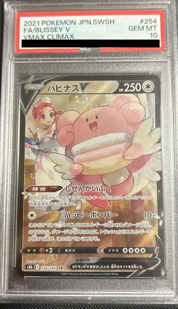 ハピナスV(254/184)は、無色タイプのたねポケモンVで、HPは250です。特性「しぜんかいふく」により、自分の手札からこのポケモンにエネルギーをつけるたびに、このポケモンの特殊状態をすべて回復します。ワザ「ハッピーボンバー」は無色エネルギー1つで10ダメージを与え、このポケモンについているエネルギーの数×30ダメージを追加します。さらに、ダメージを与えたあと、望むならトラッシュからエネルギーを3枚まで選び、このポケモンにつけることができます。弱点は闘タイプ(×2)、逃げるためのエネルギーは3つです。デッキでは、特性を活かして特殊状態からの早期回復を図り、ワザでエネルギーを加速しつつ高火力を狙えるアタッカーとして活躍します。CSR(キャラクタースーパーレア)版は、特別なイラストが施され、コレクション性が高いです。