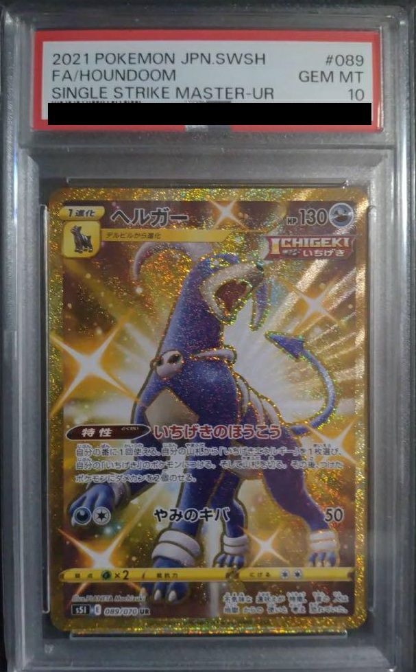 ヘルガー(089/070)は、悪タイプの1進化ポケモンで、HP130を持ちます。特性「いちげきのほうこう」により、自分の番に1回、山札から「いちげきエネルギー」を1枚選び、自分の「いちげき」のポケモンにつけ、その後、つけたポケモンにダメカンを2個のせることができます。ワザ「やみのキバ」は、悪エネルギー1個と無色エネルギー1個で50ダメージを与えます。この特性により、デッキ内のエネルギー加速が可能となり、「いちげき」デッキの展開をサポートします。ウルトラレア(UR)版のイラストは、金色に輝くデザインが特徴で、コレクション性が高い一枚です。