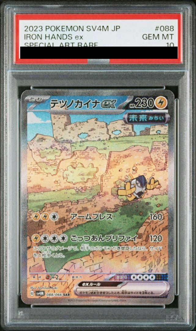 テツノカイナex(088/066)[SAR]は、拡張パック「未来の一閃」に収録された雷タイプのたねポケモンexです。ワザ「アームプレス」は160ダメージを与え、「ごっつあんプリファイ」は120ダメージを与え、このワザで相手のポケモンをきぜつさせた場合、サイドを1枚多く取ることができます。このカードは、高火力のワザと追加のサイドカード獲得効果を活かし、試合を有利に進める戦略で活躍が期待されます。スペシャルアートレア(SAR)版は、特別なイラストと光沢加工が施され、コレクション性も高い一枚です。