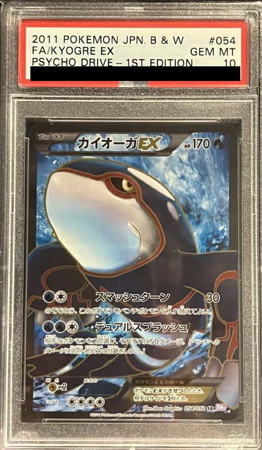 カイオーガEX(054/052)は、拡張パック「サイコドライブ」に収録された水タイプのたねポケモンEXで、HPは170です。ワザ「スマッシュターン」は、水エネルギー1つと無色エネルギー1つで30ダメージを与え、望むならこのポケモンをベンチポケモンと入れ替えることができます。「デュアルスプラッシュ」は、水エネルギー2つと無色エネルギー1つで、相手のポケモン2匹にそれぞれ50ダメージを与えます(ベンチポケモンには弱点・抵抗力を計算しません)。デッキでは、柔軟な立ち回りと複数のポケモンへの同時攻撃が可能な戦術で活躍します。SR(スーパーレア)版のカードは、特別なホログラフィック加工が施され、美麗なデザインが特徴です。
