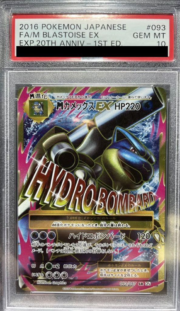 MカメックスEX(093/087)は、HP220の水タイプM進化ポケモンで、ワザ「ハイドロボンバード」により、相手のバトルポケモンに120ダメージを与え、さらにベンチポケモン2匹にも各30ダメージを与えます。この強力なワザは、相手の複数のポケモンに同時にダメージを与える戦略的な攻撃手段としてデッキで活躍します。また、SR(スーパーレア)仕様のカードは、通常版とは異なる豪華なイラストや加工が施されており、コレクション性も高い一枚です。