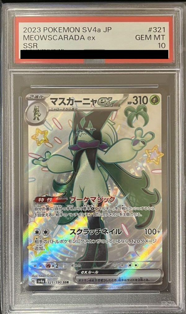 マスカーニャex(321/190)は、草タイプの2進化ポケモンで、HPは310です。特性「ブーケマジック」により、自分の番に手札から基本草エネルギーを1枚トラッシュすることで、相手のベンチポケモン1匹にダメカンを3個のせることができます。ワザ「スクラッチネイル」は無色エネルギー2個で100ダメージを与え、相手のバトルポケモンにダメカンがのっている場合、追加で120ダメージを与えます。このカードは、ハイクラスパック「シャイニートレジャーex」に収録されています。SSR(スーパースペシャルレア)版は、特別なイラストとホログラフィック加工が施された豪華なデザインが特徴です。