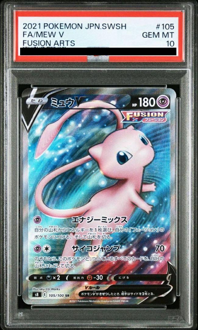 ミュウV(105/100)[SR]は、拡張パック「フュージョンアーツ」に収録された超タイプのたねポケモンVです。ワザ「エナジーミックス」は、山札からエネルギーを1枚選び、自分のフュージョンポケモンにつけることができ、序盤のエネルギー加速に役立ちます。「サイコジャンプ」は70ダメージを与え、希望すればこのポケモンとついているすべてのカードを山札に戻して切ることができ、再利用やダメージ回避に有効です。デッキでは、フュージョンポケモンのエネルギー供給や柔軟な立ち回りをサポートする役割を果たします。SR(スーパーレア)版のイラストは、ミュウの可愛らしさと神秘的な雰囲気が際立つデザインとなっています。