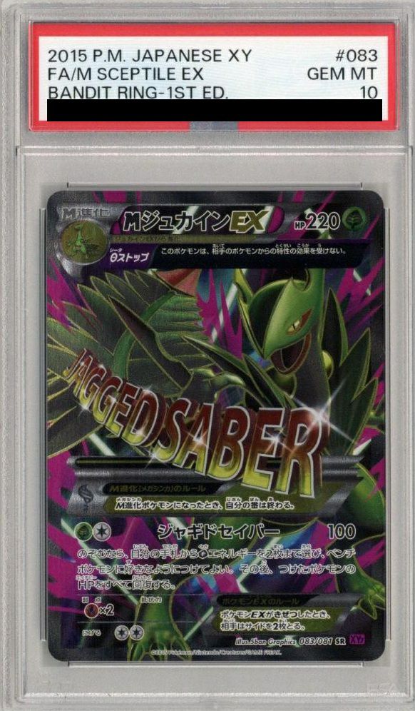 MジュカインEX(083/081)は、HP220の草タイプM進化ポケモンで、古代能力「Θストップ」により、相手のポケモンからの特性の効果を受けません。ワザ「ジャギドセイバー」は草エネルギー1つと無色エネルギー1つで100ダメージを与え、手札から草エネルギーを2枚まで自分のベンチポケモンに好きなようにつけ、そのポケモンのHPをすべて回復します。このワザにより、攻撃しながらエネルギー供給と回復を同時に行えるため、デッキの安定性を高める役割を果たします。SR(スーパーレア)仕様のカードで、美麗なイラストと加工が施され、コレクション性も高い一枚です。
