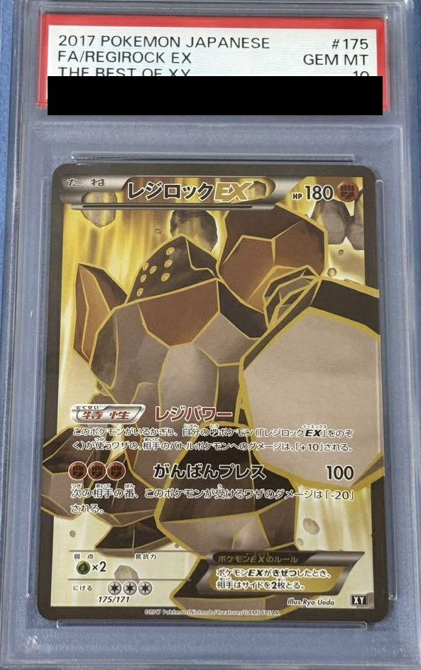 レジロックEX(175/171)[SR]は、闘タイプのたねポケモンEXで、HP180を持ちます。特性「レジパワー」により、このポケモンがいるかぎり、自分の闘ポケモン(「レジロックEX」をのぞく)が使うワザの、相手のバトルポケモンへのダメージが10増加します。ワザ「がんばんプレス」は、闘エネルギー3個で100ダメージを与え、次の相手の番、このポケモンが受けるワザのダメージを20減らす効果があります。これらの能力により、闘デッキの火力を底上げしつつ、自身の耐久力も高めることができます。イラストはRyo Ueda氏が担当し、スーパーレア(SR)仕様の特別なデザインが特徴です。このカードは、ハイクラスパック「THE BEST OF XY」に収録されています。