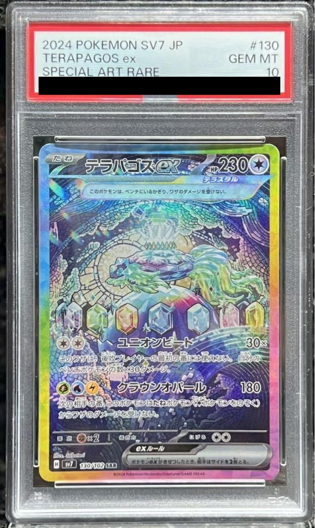 テラパゴスex(130/102)[SAR]は、拡張パック「ステラミラクル」に収録された無色タイプのたねポケモンexです。特性「テラスタル」により、ベンチにいる限りワザのダメージを受けません。ワザ「ユニオンビート」は、自分のベンチポケモンの数×30ダメージを与えますが、後攻プレイヤーの最初の番には使用できません。また、「クラウンオパール」は180ダメージを与え、次の相手の番、このポケモンはたねポケモン(ポケモンexを除く)からワザのダメージを受けません。このカードは、ベンチを活用した高火力攻撃や、たねポケモンからのダメージを防ぐ戦略で活躍が期待されます。スペシャルアートレア(SAR)版は、カラフルで神秘的なイラストが特徴で、コレクション性も高い一枚です。