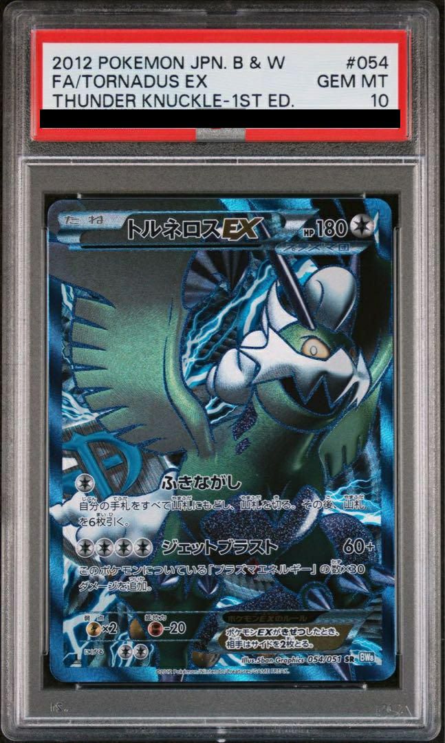 トルネロスEX(054/051)は、拡張パック「ライデンナックル」に収録された無色タイプのたねポケモンEXのスーパーレア(SR)カードです。HPは170で、ワザ「ふきながし」は手札をすべて山札に戻してシャッフルし、6枚引く効果を持ちます。「ジェットブラスト」は基本60ダメージに加え、このポケモンに付いている「プラズマエネルギー」の数×30ダメージを追加します。弱点は雷タイプ(×2)、抵抗力は闘タイプ(-20)、逃げるためのコストは1です。イラストはEske Yoshinob氏が手掛け、トルネロスの力強い姿が描かれています。