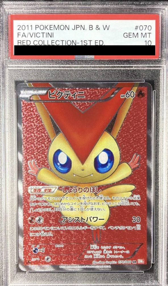 ビクティニ(070/066)は、2011年7月15日発売の拡張パック「レッドコレクション」に収録された炎タイプのたねポケモンで、HPは60です。特性「しょうりのほし」は、自分のポケモンのワザでコインを投げたとき、その結果をすべて無効にし、コインを投げ直すことができます(ただし、ビクティニが何匹いても、この特性は自分の番に1回しか使えません)。ワザ「アシストパワー」は30ダメージを与え、このポケモンについているエネルギーをすべてベンチポケモン1匹につけ替える効果を持ちます。デッキにおいては、コイン判定を伴うワザの成功率を高めるサポート役として活躍します。SR(スーパーレア)仕様のカードで、特別なイラストと光沢加工が施されており、コレクション性も高い一枚です。