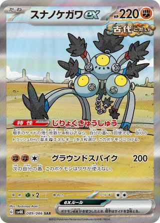 スナノケガワex(089/066)は、拡張パック「古代の咆哮」に収録された闘タイプのたねポケモンexで、レアリティはスペシャルアートレア(SAR)です。HPは220で、特性「じりょくきゅうしゅう」は、相手のサイドの残り枚数が4枚以下のとき、自分の番に1回使え、自分のトラッシュから基本エネルギーを1枚選び、このポケモンにつけることができます。ワザ「グラウンドスパイク」は闘エネルギー2個で200ダメージを与え、次の自分の番、このポケモンはワザが使えなくなります。デッキでは、特性を活かしてエネルギー加速を行い、強力な攻撃を繰り出す戦術が考えられます。SAR版は、通常版とは異なる特別なイラストや加工が施され、コレクターから高い評価を受けています。