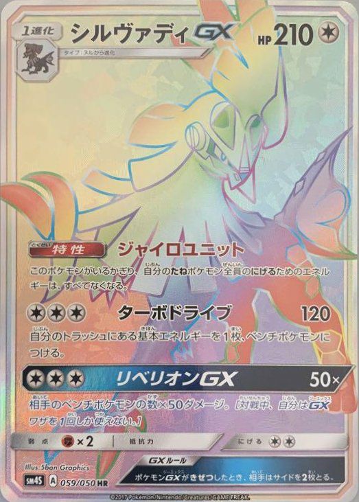 シルヴァディGX(059/050)[HR]は、無色タイプの1進化ポケモンで、HPは210です。特性「ジャイロユニット」により、自分のたねポケモン全員のにげるためのエネルギーがゼロになります。ワザ「ターボドライブ」は無色エネルギー3個で120ダメージを与え、自分のトラッシュにある基本エネルギーを1枚、ベンチポケモンに付けることができます。GXワザ「リベリオンGX」は、相手のベンチポケモンの数×50ダメージを与えます。弱点は闘タイプ(×2)、逃げるためのエネルギーは2個です。HR(ハイパーレア)仕様のため、通常版よりも希少価値が高く、コレクターに人気があります。