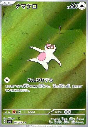 ナマケロ(117/106)は、拡張パック「超電ブレイカー」に収録された無色タイプのたねポケモンで、アートレア(AR)仕様のカードです。HPは60で、ワザ「のんびりする」は無色エネルギー1個でこのポケモンのHPを60回復します。ただし、次の自分の番、このポケモンは逃げられなくなります。弱点は闘タイプ(×2)、抵抗力はなく、逃げるためのコストは2です。進化前のポケモンとして、ヤルキモノやケッキングへの進化につなげる役割を持ちます。イラストはShigenori Negishi氏が手掛けています。