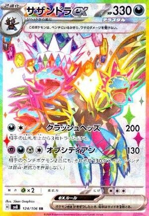 サザンドラex(124/106)は、悪タイプの2進化ポケモンで、HP330を持ちます。特性「テラスタル」により、ベンチにいる限りワザのダメージを受けません。技「クラッシュヘッズ」は、悪エネルギー1個と無色エネルギー1個で200ダメージを与え、相手の山札を上から3枚トラッシュします。「オブシディアン」は、超・悪・鋼・無色エネルギー各1個で、バトルポケモンに130ダメージを与え、相手のベンチポケモン2匹にもそれぞれ130ダメージを与えます。デッキでは、高いHPと特性を活かし、強力な攻撃で相手の場を制圧する役割を果たします。また、SR(スーパーレア)版のカードは、通常版とは異なる豪華なイラストやホログラフィック加工が施されており、コレクターズアイテムとしても高い価値があります。