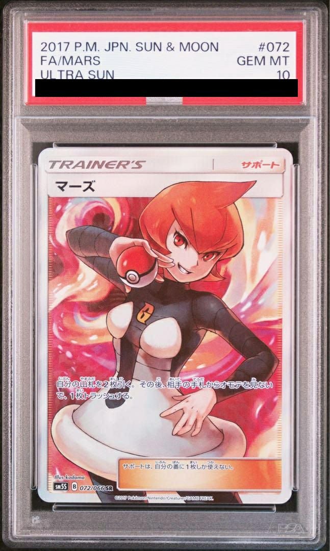 マーズ(072/066)は、拡張パック「ウルトラサン」に収録されたサポートカードのスーパーレア(SR)版です。効果は、自分の山札を2枚引き、その後、相手の手札から1枚をランダムにトラッシュするというものです。このカードは、相手の手札を減らしつつ、自分のドローを進める戦略的なプレイを可能にします。SR仕様のため、通常版とは異なる豪華なイラストが施されており、コレクション価値も高い一枚です。