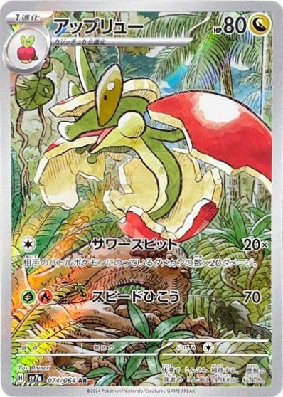アップリュー(074/064)は、強化拡張パック「楽園ドラゴーナ」に収録されたアートレア(AR)の1進化ドラゴンタイプポケモンで、HP80を持ちます。ワザ「サワースピット」は、相手のバトルポケモンにのっているダメカンの数×20ダメージを与え、「スピードひこう」は70ダメージを与えます。イラストはGOTO minori氏が担当し、アップリューが自然の中でリラックスしている様子が描かれています。