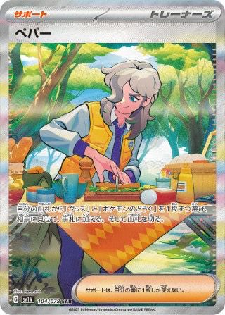 ペパー(104/078)は、拡張パック「バイオレットex」に収録されたスペシャルアートレア(SAR)のサポートカードです。効果は通常版と同様に、山札から「グッズ」と「ポケモンのどうぐ」を各1枚手札に加えることができます。イラストはkantaro氏が担当しており、ペパーが料理をしているシーンが描かれています。
