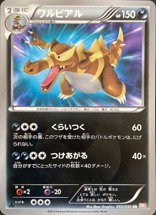 ワルビアル(055/050)[UR]は、ポケモンカードゲームBWシリーズの拡張パック「リューノブレード」に収録された悪タイプの2進化ポケモンです。HPは150で、ワザ「くらいつく」は60ダメージを与え、相手のバトルポケモンを次の番に逃げられなくします。また、「つけあがる」は自分が取ったサイドの枚数×40のダメージを与える強力な技です。このカードは色違いのイラストが特徴で、コレクターズアイテムとしても高い人気を誇ります。デッキでは、終盤に「つけあがる」で大ダメージを狙うフィニッシャーとして活躍します。