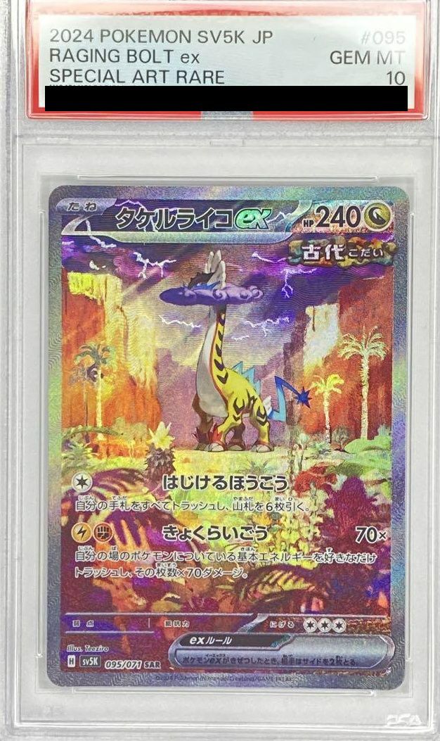 タケルライコex(095/071)は、ドラゴンタイプのたねポケモンで、HPは240です。ワザ「はじけるほうこう」は手札をすべてトラッシュし、山札から6枚引く効果があります。「きょくらいごう」は、自分の場のポケモンに付いている基本エネルギーを好きなだけトラッシュし、その枚数×70ダメージを与えます。これにより、高火力を狙えるため、エネルギー加速手段と組み合わせることで、デッキの主力として活躍が期待できます。イラストはTeeziro氏が担当し、タケルライコの力強さが際立っています。