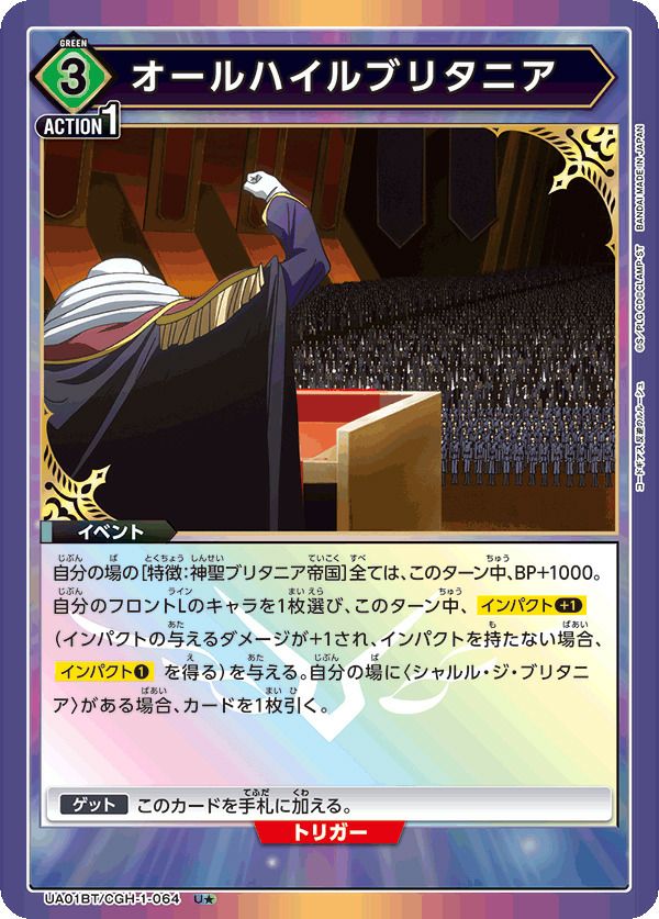 他の画像を見る 販売価格 ¥ 100 〜 ¥ 270 税込 販売価格 ¥ 税込 状態A 状態B 状態C 状態D オールハイルブリタニア(UA01BT/CGH-1-064)[U★] 商品詳細を見る お気に入りに登録する 在庫切れ