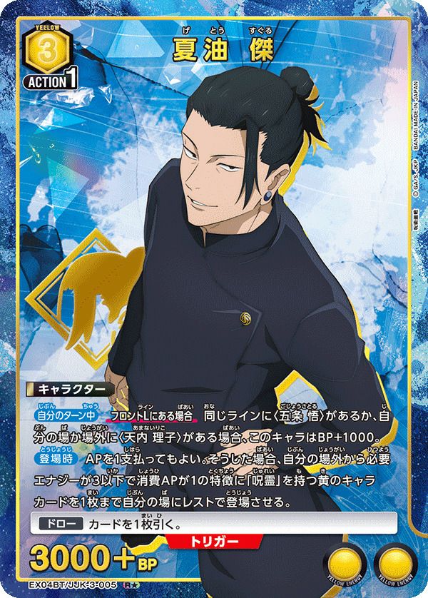 他の画像を見る 販売価格 ¥ 1,080 〜 ¥ 2,700 税込 販売価格 ¥ 税込 状態A 状態B 状態C 状態D 夏油 傑(EX04BT/JJK-3-005)[R★] 商品詳細を見る お気に入りに登録する 在庫切れ