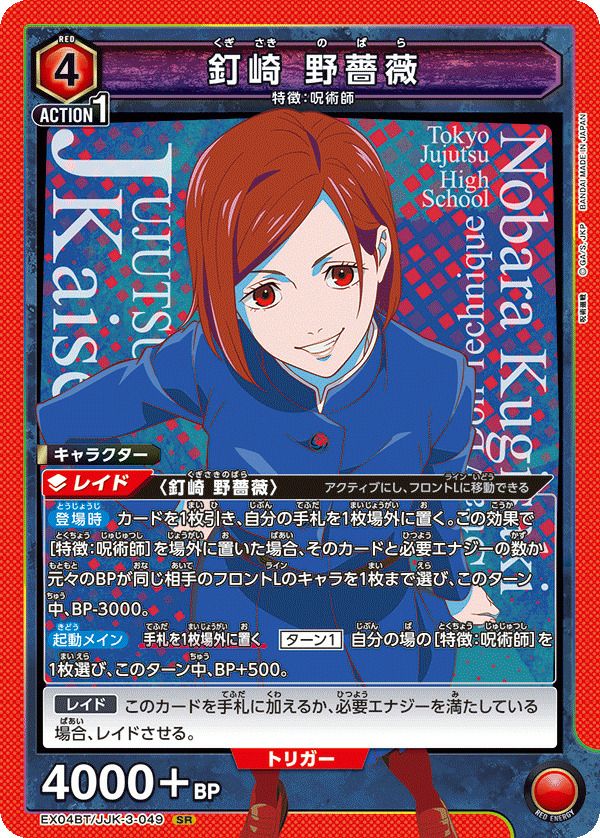 他の画像を見る 販売価格 ¥ 30 〜 ¥ 90 税込 販売価格 ¥ 税込 状態A 状態B 状態C 状態D 釘崎 野薔薇(EX04BT/JJK-3-049)[SR] 商品詳細を見る お気に入りに登録する 在庫切れ