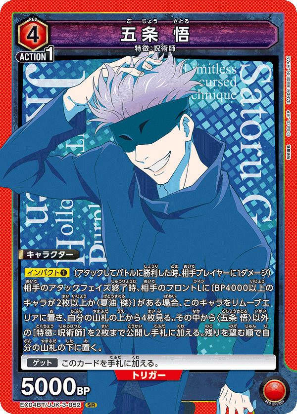 他の画像を見る 販売価格 ¥ 70 〜 ¥ 180 税込 販売価格 ¥ 税込 状態A 状態B 状態C 状態D 五条 悟(EX04BT/JJK-3-052)[SR] 商品詳細を見る お気に入りに登録する 在庫切れ