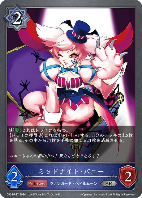 他の画像を見る 販売価格 ¥ 160 〜 ¥ 400 税込 販売価格 ¥ 税込 状態A 状態B 状態C 状態D ミッドナイト・バニー(CP03-P37)[SR・プレミアム] 商品詳細を見る お気に入りに登録する 在庫切れ